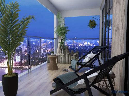 热带植物与舒适躺椅在透明栏杆前“依偎”——太阳在浩瀚的天际线升落,撒下一片暗夜蓝,唯美壮丽的景观就是这里的生活日常。