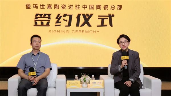 签约仪式后,各大媒体朋友们分别对堡玛世嘉陶瓷总经理何志坤先生,以及佛山中国陶瓷城集团总裁助理、中国(佛山)陶瓷总部总经理、中国(淄博)陶瓷总部总经理汤洁明进行采访。