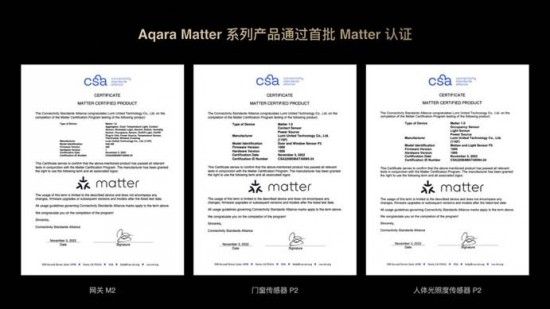 值得一提的是,CSA连接标准联盟在10月初已正式对外发布Matter 1.0标准和认证流程,Aqara等联盟成员积极响应,发挥自身技术、经验和生态优势,携手推进Matter协议的规范开发、设计、测试以及验证,促进Matter协议在全球范围内更快落地。目前Aqara已成为首批获得Matter认证的品牌之一,目前Aqara网关M2、门窗传感器 P2、人体光照度传感器 P2 已通过 Matter 认证,进一步推进了Matter 协议在全球的普及和落地。