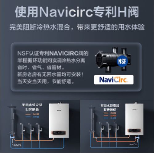 针对上述改造成本高的问题,庆东纳碧安零冷水系列产品采用独家专利Navicirc专利H阀装置,帮助家里没有回水管的用户实现零冷水自由,还不用担心热水窜到冷水管的问题。另外H阀获得美国NSF认证,能够实现进出水品质一致。可以说,只要有Navicirc专利H阀装置,就能完美解决全天循环费燃气、回水管、窜水问题。