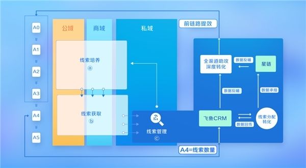 在线索管理阶段,高效承接后续经营动作。企业可以对线索进行“深加工”,在获取有效线索后,可以通过飞鱼CRM、飞鱼开放平台等产品进行智能跟进,有效利用;在线索发生有效转化后,企业可将三方CRM或飞鱼数据传回传给平台,也可借助星链等产品能力,进行数据复用,提升长周期转化效果。