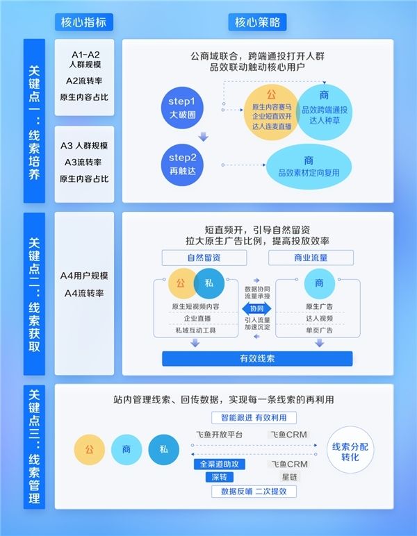 「一站式线索经营解决方案」,跨越公、商、私多域内容与流量,在一个平台内运营「线索培养——线索获取——线索管理」三个关键动作。对于线索经营的关键动作,巨量引擎也分别提出了适配的策略和打法: