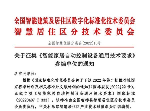 新浪家居智能家居频道讯 11月3日,据智标委智慧住区分委会消息,根据《国家标准化管理委员会关于下达2022年第二批推荐性国家标准计划及相关标准外文版计划的通知》(国标委发[2022]22号),正式立项《智能家居自动控制设备通用技术要求》国家标准(20220407-T-333)。据悉,《智能家居自动控制设备通用技术要求》国家标准,将规范智能家庭系统中智能家居自动控制终端自主协同工作所涉及的系统基本架构、设备要求、控制要求、控制安全要求、扩展要求和评价规则指导依据。同时,智标委智慧住区分委会征集参编单位。