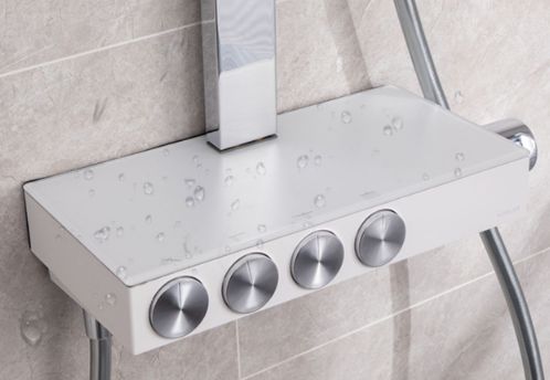 约302mm(长)* 149mm(宽)超大置物平台,也是科勒艾贝+灵控恒温三出水淋浴柱的吸睛之处,可以将洗浴用品轻松置放,洗浴时触手可及,更加方便。龙头本体玻璃平面采用易清洁镀层,水流不易留存,可有效防止水垢产生,不仅让卫浴空间看起来更加赏心悦目,美观整洁,也更易于打理。