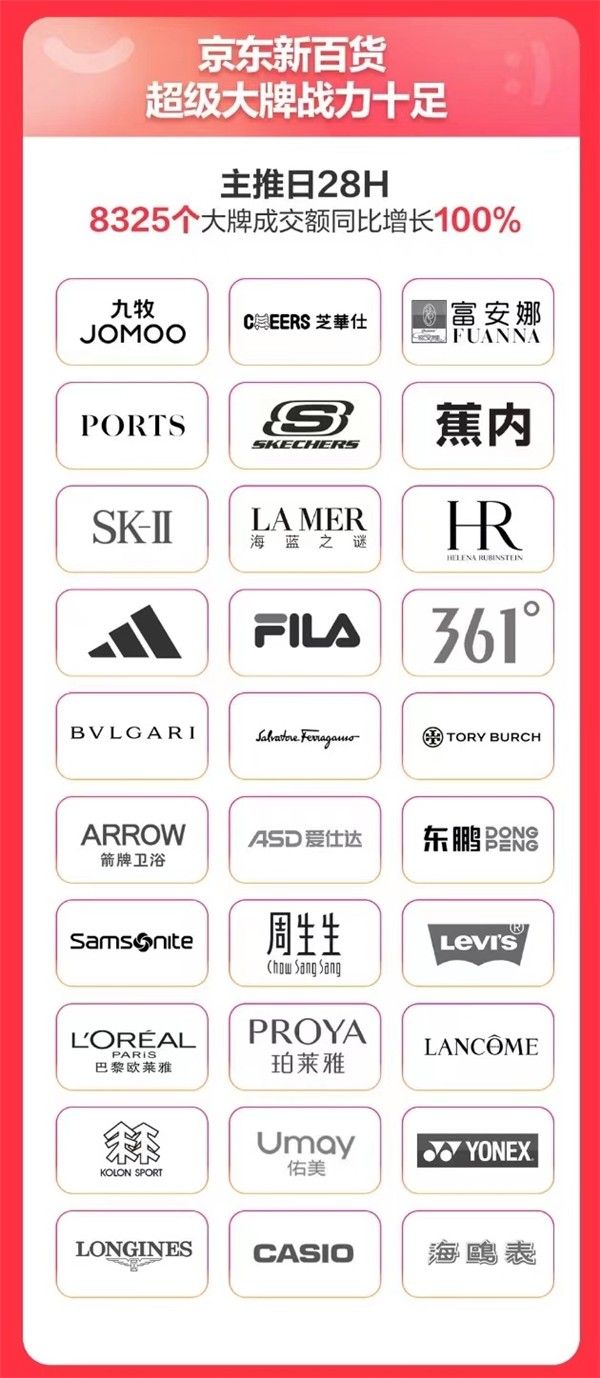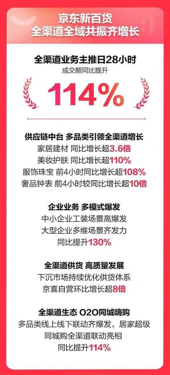 作为集线上线下消费体验于一体的新时尚生活精选集合业态,京东新百货全渠道全域共振齐增长,主推日28小时全渠道业务成交额同比提升114%。