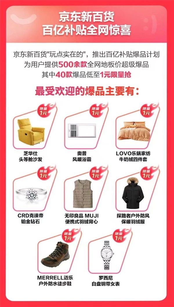 作为群主推日的超级中意日当天,京东新百货携京东百亿补贴“玩点实在的”,为消费者奉上500余款全网地板价超级爆品,其中40款爆品低至1元限量抢。芝华仕头等舱沙发、奥普风暖浴霸、LOVO乐蜗家纺牛奶绒四件套、CRD克徕帝铂金钻石、无印良品MUJI便携式羽绒背心、探路者户外防风保暖羽绒服、MERRELL迈乐户外防水徒步鞋、罗西尼白盘钢带女表等高价值好物,全部限量1元抢。