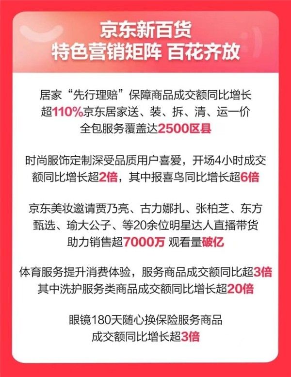 特色服务和整合营销也在京东新百货主推日大放异彩。居家“先行理赔”保障商品成交额同比增长超110%,京东居家送、装、拆、清、运一价全包服务覆盖达2500区县。