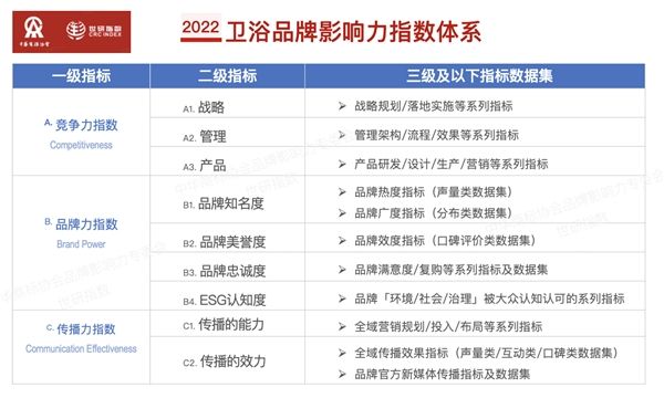 2022中国卫浴品牌影响力指数是基于家居行业「品牌影响力指数」的方法论及多级指标架构,由竞争力指数、品牌力指数和传播力指数三者构成一级指标,进一步展开二级指标、三级及以下指标数据集,形成多维度指标独立存在又相互作用的影响力评价的系统结构。