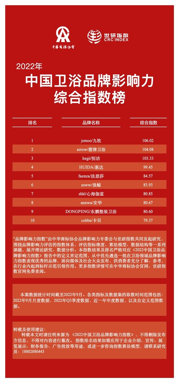 本次指数报告遴选入围百余家中国卫浴品牌,对31.36亿条数据进行建模运算,结合业界资深行家、课题组专家意见建议,经多轮评议考证,通过指数呈现出了一批中国卫浴行业颇具影响力的优秀品牌,其中前10名品牌是:jomoo/九牧、arrow/箭牌卫浴、hegii/恒洁、HUIDA/惠达、faenza/法恩莎、ssww/浪鲸、shkl/心海伽蓝、annwa/安华、DONGPENG/东鹏整装卫浴、cobbe/卡贝(报告完整版可在中华商标协会官网、世研指数官网免费查阅)
