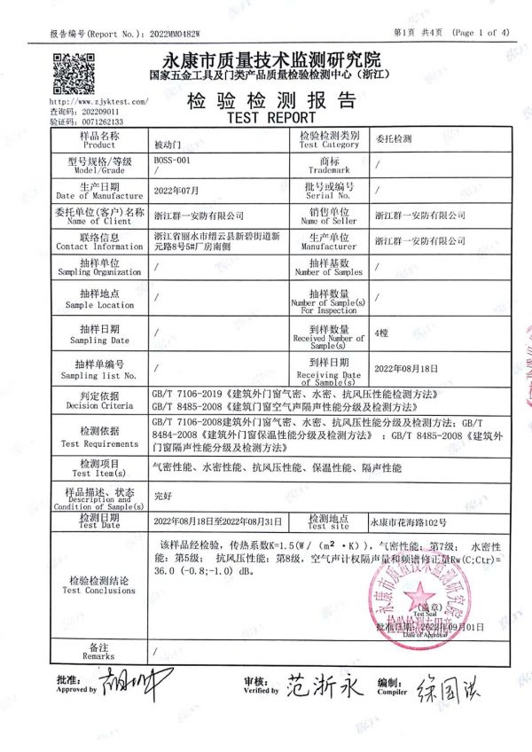 依据GB/T 8485-2008《建筑门窗空气声隔声性能分级及检测方法》国家评定等级评定,BOSS被动式入户门四项检测均高于国家标准。