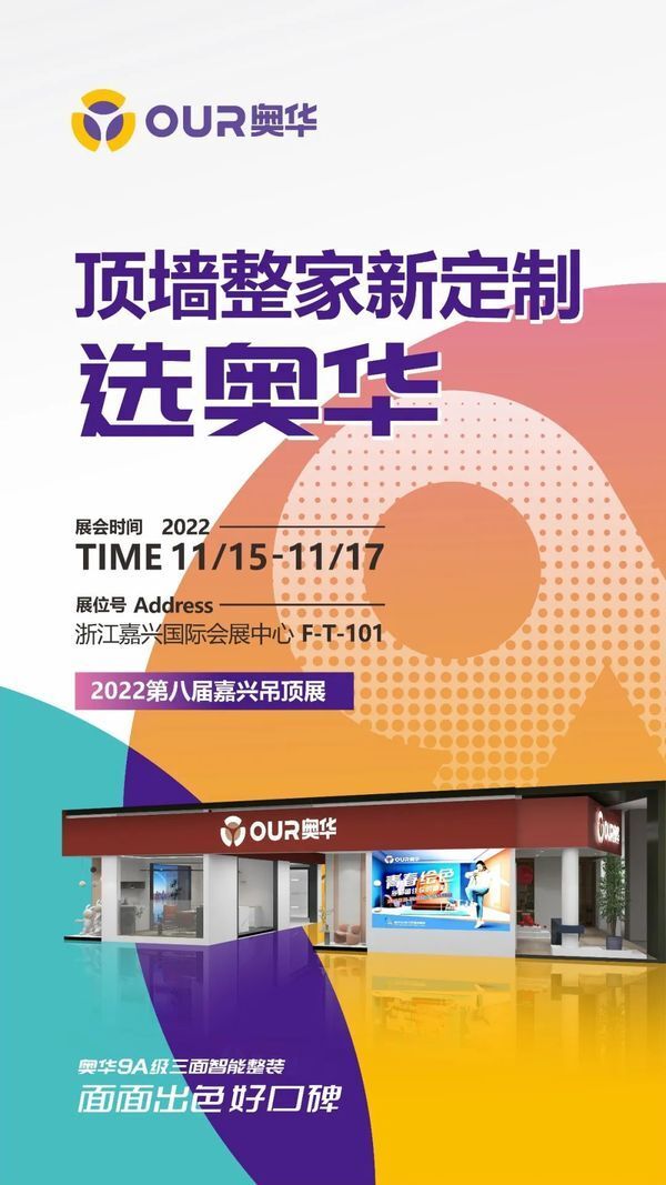 11月15日-17日,2022年第八届嘉兴吊顶展,奥华将携顶、墙、地三面产品震撼亮相。