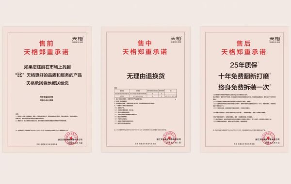 此外,天格更提出了刷新行业纪录的“五大承诺”,从购买时的退换货,到超长的保修和质保期,以及免费翻新、免费拆装等增值服务,几乎贯彻了地板的整个消费生命周期。“五大承诺”的提出给予了消费者最安心的消费保障,深刻践行了“售后保障不麻烦”。