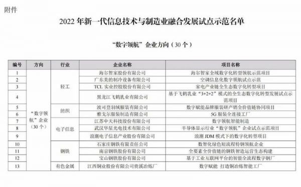 日前,工信部官网公示了2022年新一代信息技术与制造业融合发展试点示范名单,包括“数字领航”企业、两化融合管理体系贯标、特色专业型工业互联网平台三个方向。其中国家首批“数字领航”企业共涉及9大领域,海尔智家、长城汽车、波司登等30家企业成功入选。