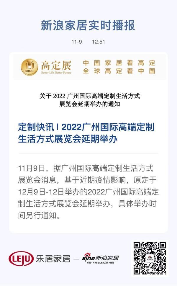 新浪定制频道讯 11月9日,据广州国际高端定制生活方式展览会消息,基于近期疫情影响,原定于12月9日-12日举办的2022广州国际高端定制生活方式展览会延期举办,具体举办时间另行通知。