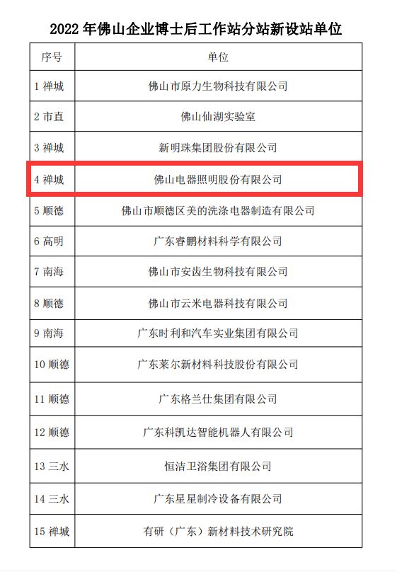 近日,经全国博士后管委会批准,佛山照明获批成立佛山企业博士后科研工作站分站。此次获批,充分展示了佛山照明研发创新实力及对人才与科技创新的高度重视。