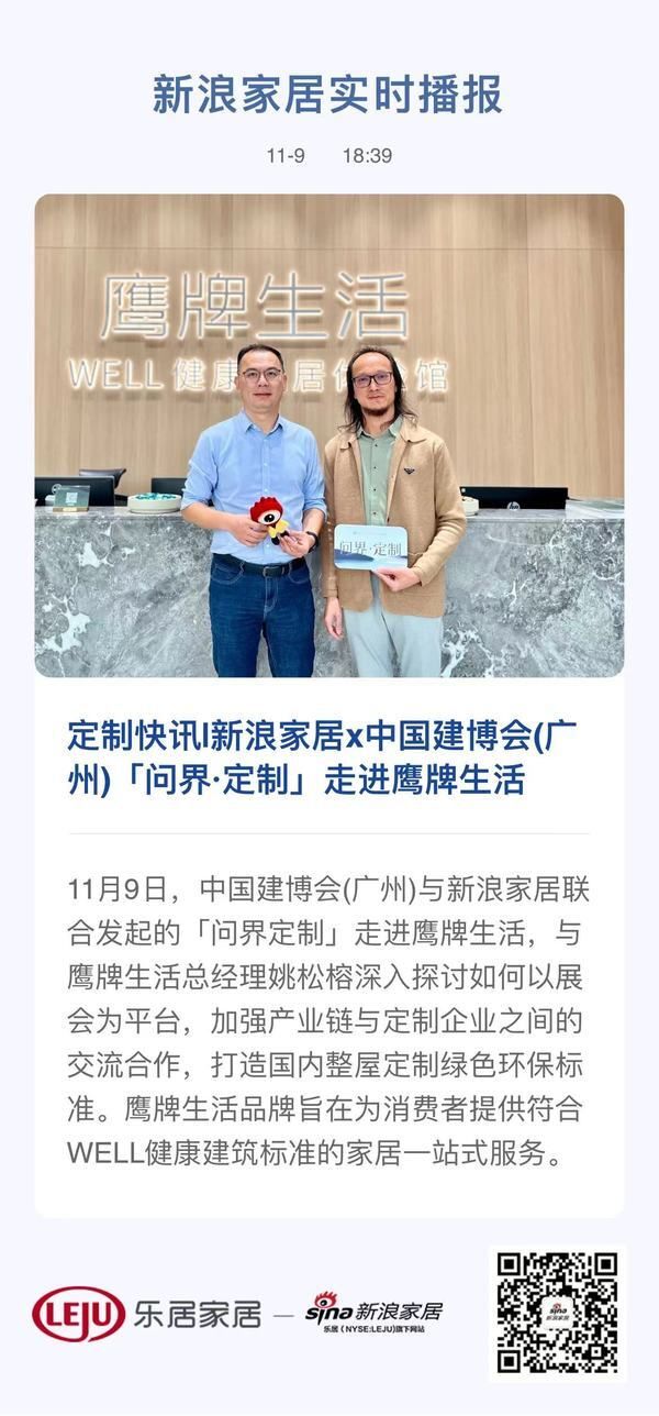 新浪定制频道讯 11月9日下午,中国建博会(广州)与新浪家居联合发起的「问界定制」走进鹰牌生活,与鹰牌生活总经理姚松榕深入探讨如何以展会为平台,加强产业链与定制企业之间的交流合作,打造国内整屋定制绿色环保标准。鹰牌生活品牌旨在为消费者提供符合 WELL健康建筑标准的家居一站式服务。