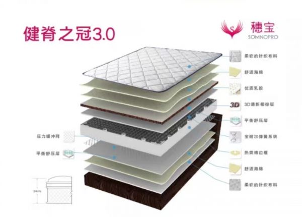 除此以外,【穗宝.健脊之冠3.0】还填充了一些舒适的海绵、热烘棉边框,压力缓冲网等,以此来组成床垫的内部系统,增强床垫的弹性和耐力。