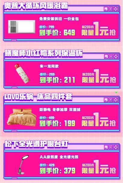 冬季气温下降,居家保暖模式开启,让人从头暖到脚的奥普大循环风暖浴霸、高颜值暖心的膳魔师小红帽系列保温杯、加厚双面绒的罗莱乐蜗床品四件套等均以1元超值秒杀价回馈消费者。此外,原价429元的松下全光谱护眼台灯,为孩子带来更自然的用光环境,且符合“儿童近视防控标准”,也能以1元超值价带回家。