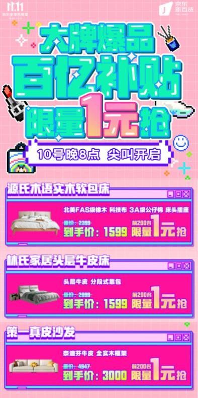 11月10日晚8点,京东11.11进入高潮期,京东新百货同步开启“大牌爆品百亿补贴限量1元抢”活动,带来多款高价值居家好物,覆盖床、沙发、四件套、保温杯、灯、浴霸等多品类,以实实在在的价格帮助消费者轻松焕新高品质美好生活。