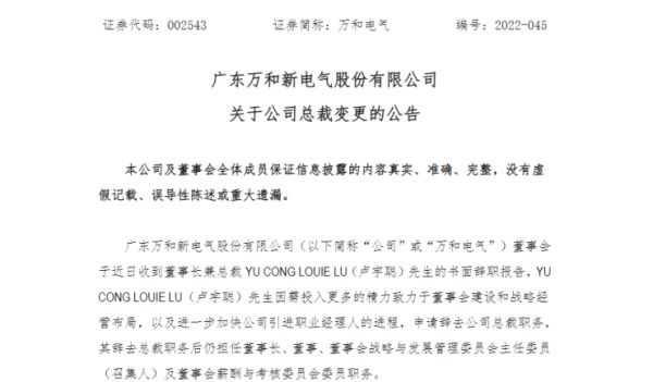 11月10日,万和电气(002543.SZ)发布公告称,YUCONGLOUIELU(卢宇聪)先生因需投入更多的精力致力于董事会建设和战略经营布局,以及进一步加快公司引进职业经理人的进程,申请辞去公司总裁职务,其辞去总裁职务后仍担任董事长、董事、董事会战略与发展管理委员会主任委员(召集人)及董事会薪酬与考核委员会委员职务。