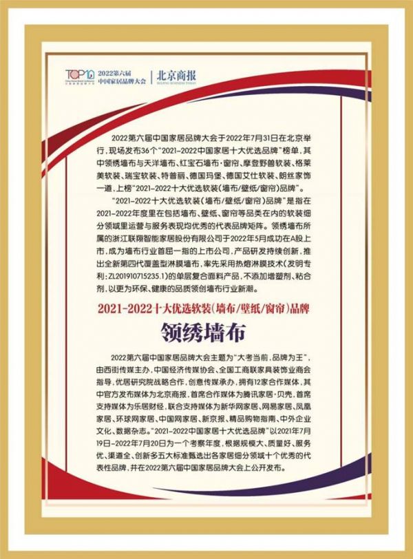 由中国经济传媒协会、全国工商联家具装饰业商会指导,优居研究院战略合作,腾讯家居·贝壳、乐居财经、新华网家居和网易家居等12家主流媒体支持的2022第六届中国家居品牌大会,以“大考当前,品牌为王”为主题,于2022年7月31日在北京举行并现场发布36个“2021-2022中国家居十大优选品牌”榜单。其中,领绣墙布从一众品牌中脱颖而出,荣誉上榜。