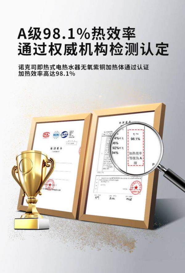 诺克司“HI-Nioheat海立特”加热元件采用纯度高达99.95%的加厚T2无氧紫铜作为发热体核心材料,热水器热效率高达98.1%,大大降低了热量损失。