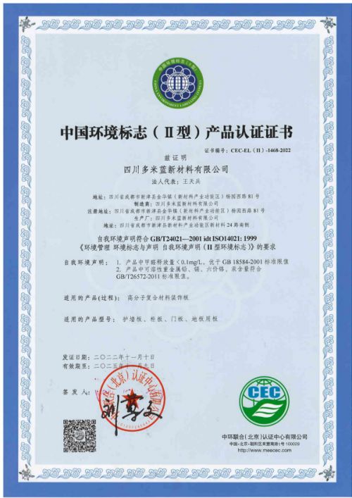 近日,多米蓝凭借着绿色环保的护墙板、木门、定制柜等系列产品,荣获“中国环境标志Ⅱ型产品认证”,即“十环认证”。
