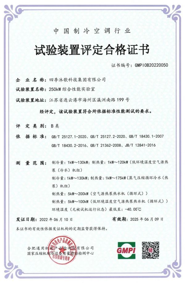 就在今年,四季沐歌集团250kW综合性能实验室成功通过合肥通用机械产品认证有限公司(GC)评测,并被授予GC评定合格证书,成为国内具备-40℃实验室认定的综合性能实验室。此次认证通过后,标志着四季沐歌集团空气能实验室,已具备可模拟测试中国所有城市环境气候的能力。