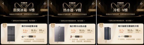在天猫V榜,海尔526超薄冰箱、海尔抽屉无霜储奶冷柜、海尔零冷水热水器等爆品,分别登上厨房冰箱、冷柜、热水器榜首。