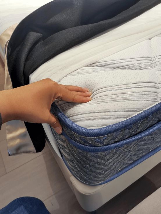 这次测试的是穗宝经典护脊系列的【健脊之冠3.0】。先说说其和肌肤接触的织面吧,柔软的针织面料,有很多的微孔设计,透气性很好。颜值上,做了类似“车轮印”的车花纹路,大方百搭;垫边上做了加固,明显的边角结构,结合内部弹簧的支撑感,增加了床垫的边沿承托力。