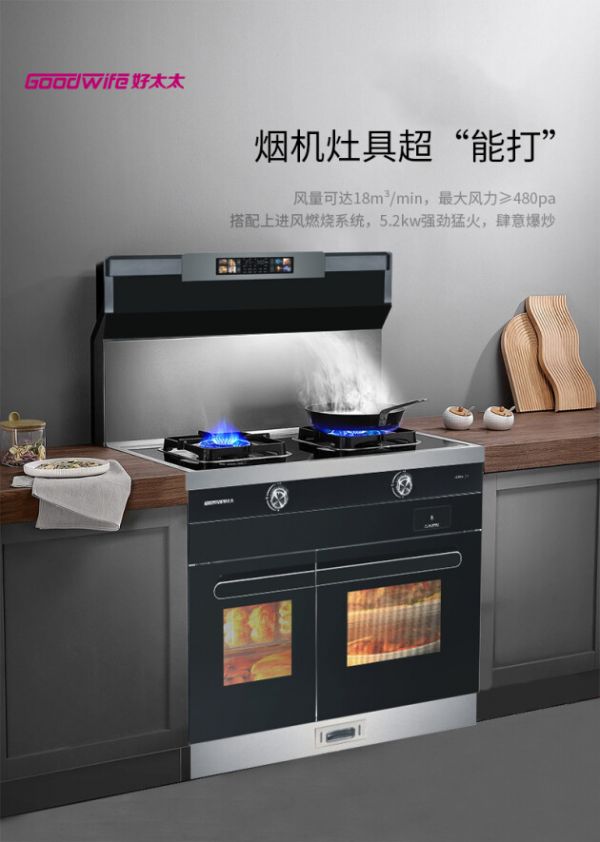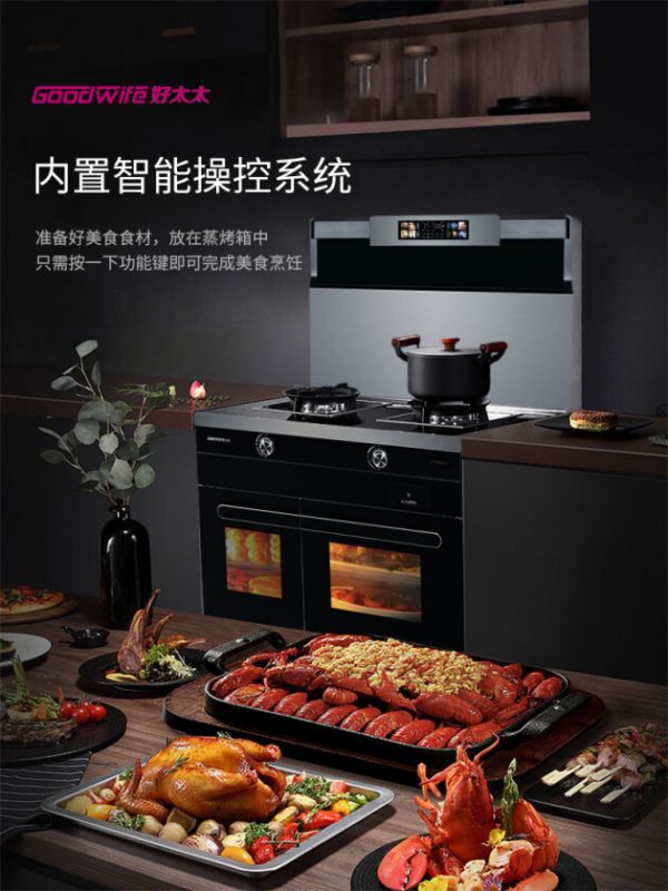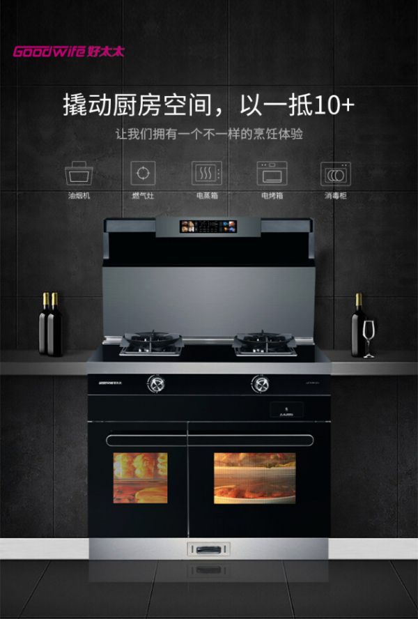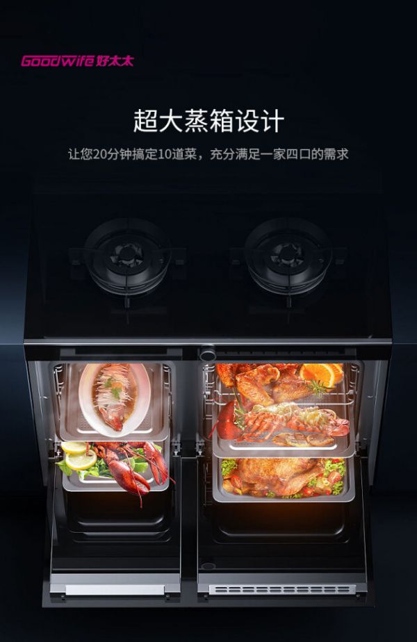 Goodwife好太太JJZT-H583ZKX集成灶,除了油烟机、燃气灶,还集成了蒸箱、烤箱、消毒柜,带来了创新烹饪、蒸烤消一体技术、高温消毒,厨房有这样一台机器就足够了。