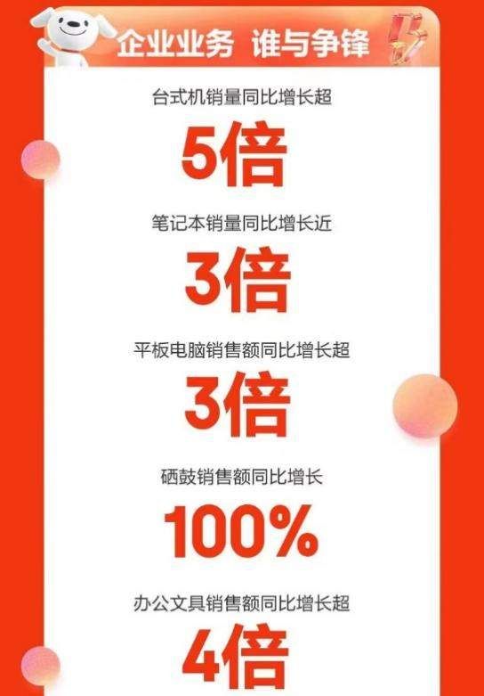 京东企业业务在B端市场渠道、客户需求理解方面有着多年的沉淀和积累,也一直以“拓展上游资源、延长办公服务链条、丰富场景集成解决方案”为抓手,不断完善对于企业商用场景的服务能力,助力企业采购更简单高效,深受企业级客户的信赖,在今年京东3C家电企业及商采11.11巅峰28小时也实现了流量的大爆发。数据显示,京东企业业务-企业购平台主会场流量同比提升100%,企业业务G平台11.11分会场流量同比提升20倍,企业业务G平台会场点击人数同比提升近4倍。