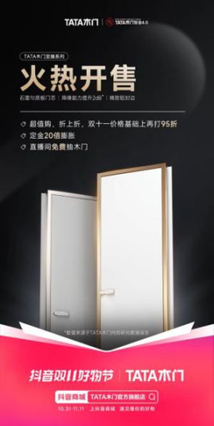 在本次双十一狂欢购物节中,TATA 木门推出以“甄选双11,全品超值购”为主题的活动,通过线上、线下双营销模式,在众多家居品牌中脱颖而出。此外,TATA 木门的全新产品---至臻系列,也空降直播间,无疑是为本次活动又添了一把强大的助力。