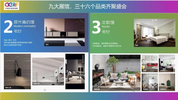 本次展会建了9大展馆,分别是原创/大牌馆,风格馆(极简/轻奢等)、木之美馆(新中、实木、红木等)、软装馆(灯具/窗帘/地毯/挂画等)、大定制/智能馆(全屋定制、智能家居等)、睡眠馆、商用馆(酒店、办公、康养等)、配套材料馆、服务馆(送装、直播、设计等);通过线上平台汇集家居行业的产品、服务等,让线上展会成为家居行业的一个综合服务平台。