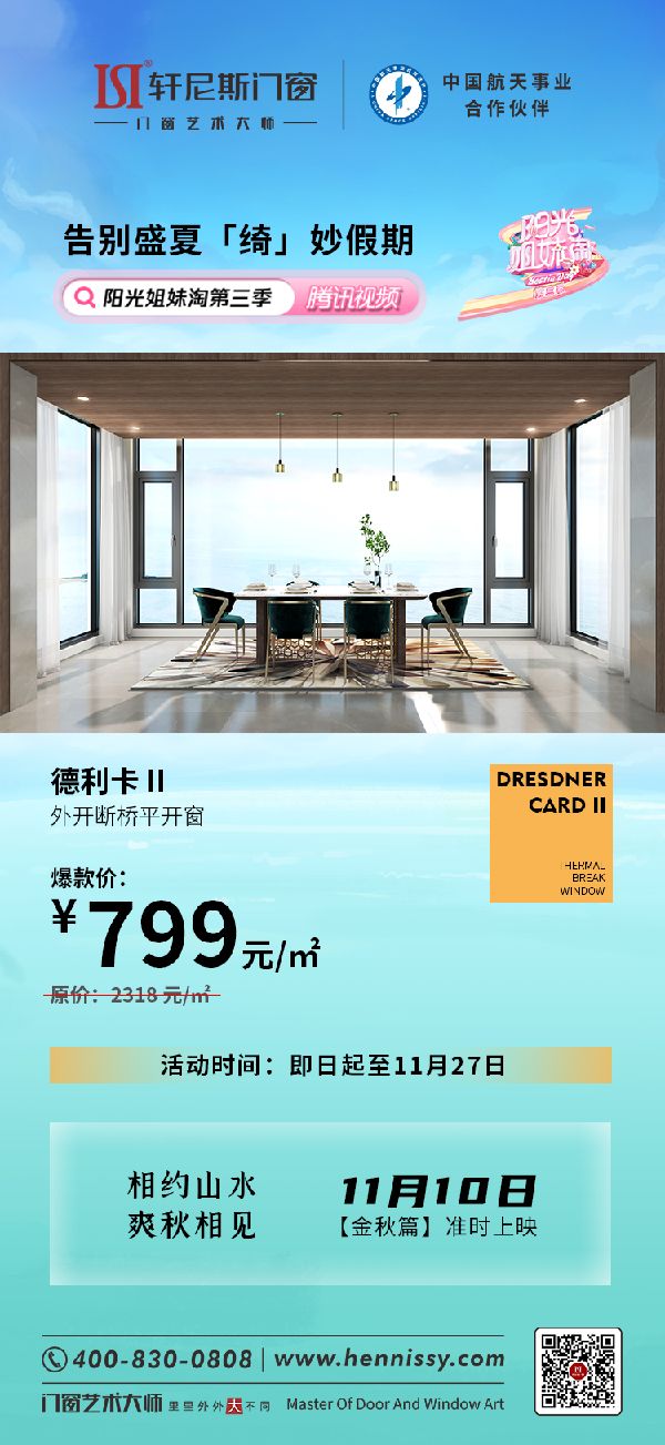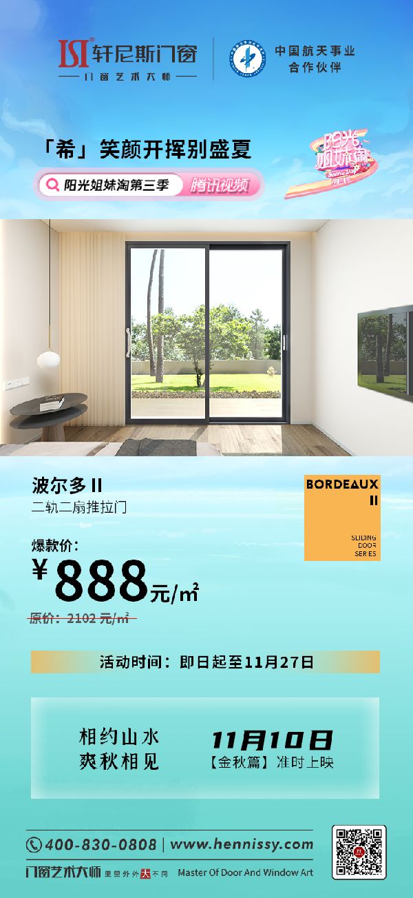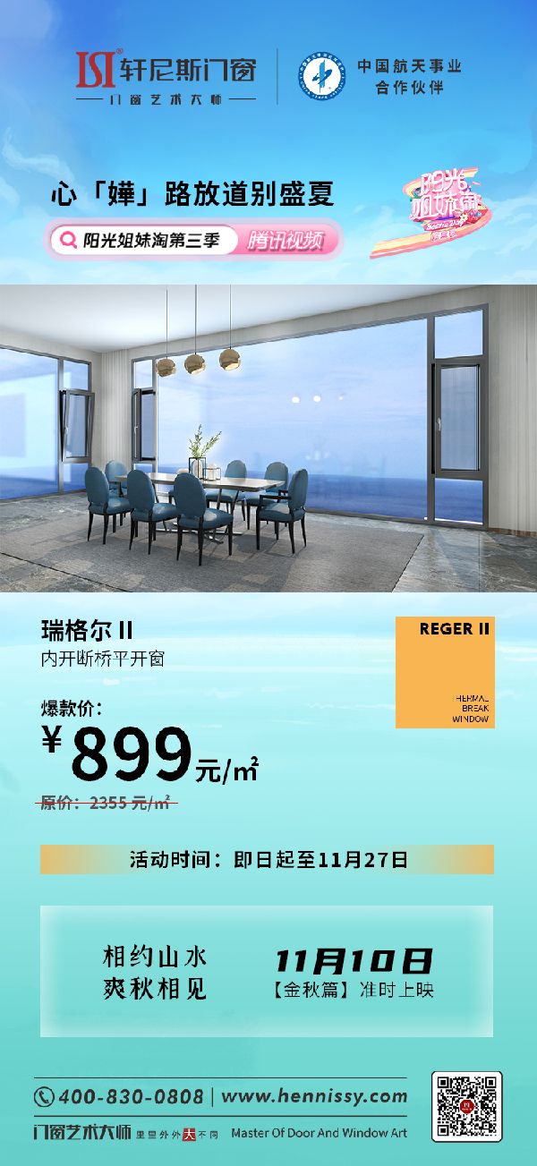 轩尼斯门窗一年一次的双十一狂欢钜惠火热进行中,即日起至11月27日,轩尼斯门窗的多款力荐星品德利卡Ⅱ外开断桥平开窗、瑞格尔Ⅱ内开断桥平开窗和波尔多Ⅱ二轨二扇推拉门推出活动惊喜价,趁着活动优惠到轩尼斯门窗全国专卖店抢购吧!