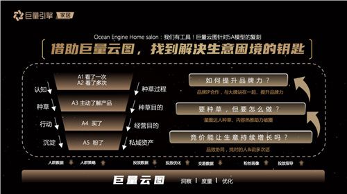 在家居派的分享中,伴随着巨量引擎营销产品的不断升级创新,结合行业营销发展需要,家居企业可以借助以巨量云图为基石的科学营销,洞察人群和投放数据,不断投放策略和效果,通过A3人群的突破,实现真正的长效经营。