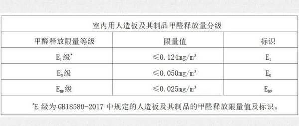 在新实施的GB/T 39600-2021《人造板及其制品甲醛释放量分级》中,将室内芯材甲醛释放量按照限量值分为 E1、E0、ENF三个级别:ENF(≤0.025mg/m³);E0(≤0.050mg/m³);E1(≤0.124mg/m³)。