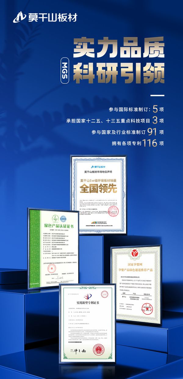 自国内明确“碳达峰碳中和”目标之后,“绿色低碳”有关的概念也迅速成为各行各业关注的焦点,而莫干山27年来,始终坚守绿色环保初心不动摇,依托国家级博士后工作站、省级企业研究院、省级企业技术中心、省级高新技术研究开发中心、云峰莫干山家居研究院CNAS实验室、省级院士专家工作站六大科研创新平台自我更新自我迭代,创新无醛添加工艺,推出豆茵板、清醛除菌生态板、抗菌抗病毒生态板等新国标ENF级系列产品。参与国际标准制订5项;承担国家十二五、十三五重点科技项目3项;参与国家标准制订及行业标准制订91项;拥有各项专利116项。