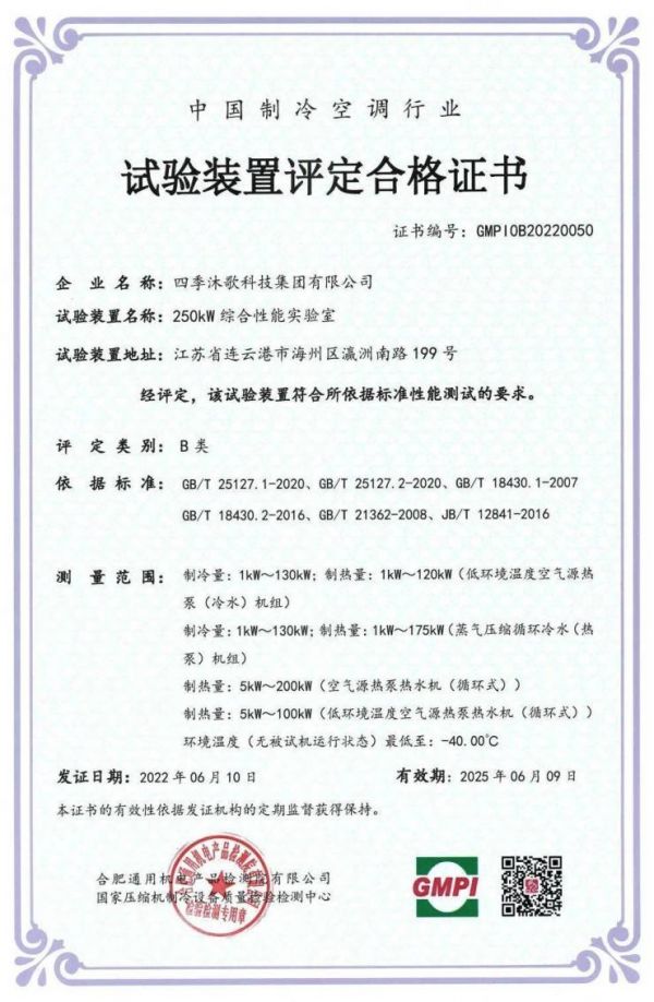 就在今年,四季沐歌集团250kW综合性能实验室成功通过合肥通用机械产品认证有限公司(GC)评测,并被授予GC评定合格证书,成为国内具备-40℃实验室认定的综合性能实验室。此次认证通过后,标志着四季沐歌集团空气能实验室,已具备可模拟测试中国所有城市环境气候的能力。
