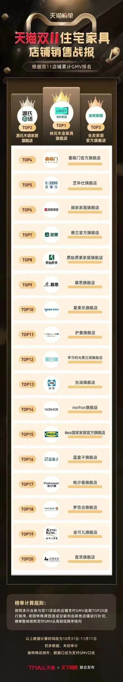 快讯 | 林氏家居、源氏木语、全友家居列天猫双11住宅家具店铺销售额前三