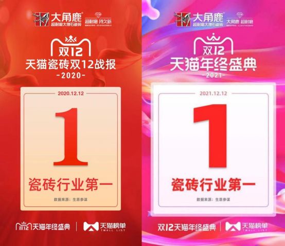 2020年,大角鹿以出色的销量成绩,力压众多优秀瓷砖品牌,拿下2020天猫双12“瓷砖行业第一”桂冠;2021年天猫双12狂欢盛典,大角鹿再度夺下“瓷砖行业第一”的销冠宝座,连续两年成为天猫双12瓷砖品类销量霸主。