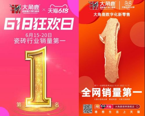 自2020年起,大角鹿开始全线布局电商新零售渠道以来,近几年在618、双11、双12等大型购物节中,大角鹿均取得不斐战绩,屡次拿下瓷砖品类销量冠军。