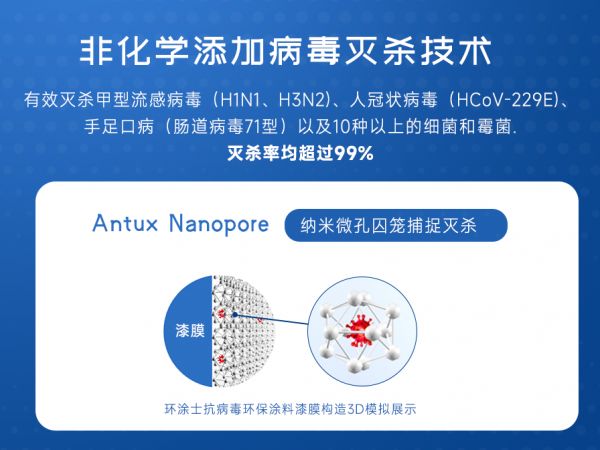 抗病毒涂料产品由上海都佰城联合德国巴斯夫沉淀了十年之久,这一全球首发技术被都佰城与巴斯夫联手赋予“环涂士”专业漆高调解封。2020年初环涂士抗病毒涂料刚刚崭露头角的时期,环涂士涂料有限公司尽管不在涂料大厂的行列,但是凭借其多年来默默坚持技术创新的决心,聚焦学校和医院用户需求创新技术的积淀,以及对市场大环境的敏锐度,再加上重量级合作伙伴——世界化工巨头德国巴斯夫的加持,于2020年3月初在上海首发了银离子抗病毒涂料新品和学校周末刷新服务以及发起了抗病毒环保涂料标准的讨论,使得银离子抗病毒涂料应用技术产品成功落地。不仅如此,环涂士与巴斯夫在短短一年时间内连续发布两项抗病毒独创技术——银离子抗病毒技术与更为环保的Antux Nanopore(环涂士纳米微孔)囚笼捕捉灭杀技术,让行业惊讶于其创新应用的速度,环涂士被冠以涂料产业第一科创品牌。