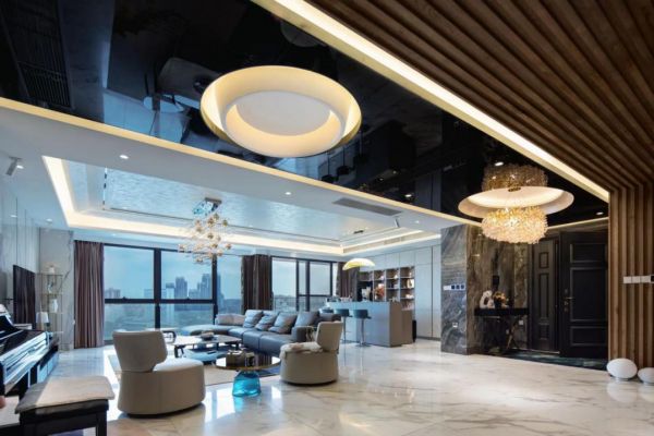 业主因为有三个小孩,整体空间除了整洁大气,空间上也尽量留白开阔,特别是客厅区域,融合了会客,聚会,水吧台,亲子活动等多个功能。摆脱纷乱的外界,安静的待在家里,享受窗外雨声潺潺,落日余晖,蝉鸣鸟叫,皓月当空,一日三餐,一年四季,伴侣在侧,孩童绕膝,这便是一个家带给我们最美的状态,也是我为业主做设计最想给他们创造的空间状态。本案材质上还用到实木格栅饰面,艺术涂料等,让各个空间相互独立又相互融合,空间既有了层次又有了视觉冲击力。