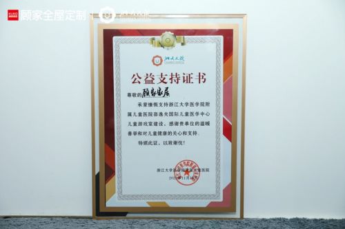 此次顾家家居对于医院游戏室的公益支持打造以及公益关爱行动,获得了医院的认可,也受到小朋友们及家长的欢迎,并荣获浙江大学医学院附属儿童医院颁发的感谢证书。