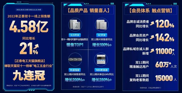 截止2022.11.11 24点,正泰居家双十一期间,线上销售额达成4.58亿,同比增长21%。多款品质产品,销量喜人,其中3LD新品开关插座喜提双十一期间天猫平台插座类目销售TOP1,6C开关、轨道插座、NB6断路器均在双十11期间实现销售额同比大幅度增长!得益于会员体系触点营销,正泰居家品牌忠诚消费者及私域忠诚人群也实现超120%的同比增长,双十一期间精准触达用户60万+人次。