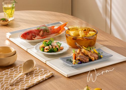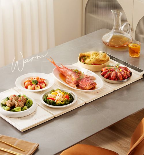最有意思的一点就是,从形状来看,区别于其他传统的大块暖菜板,它可以拼接使用,拆卸后能轻松收纳,放到橱柜等;几个人用不到3块加热板,还能拆开使用,既不费电又实用;遇到聚餐,拼上5块板,就能加热10个菜了。