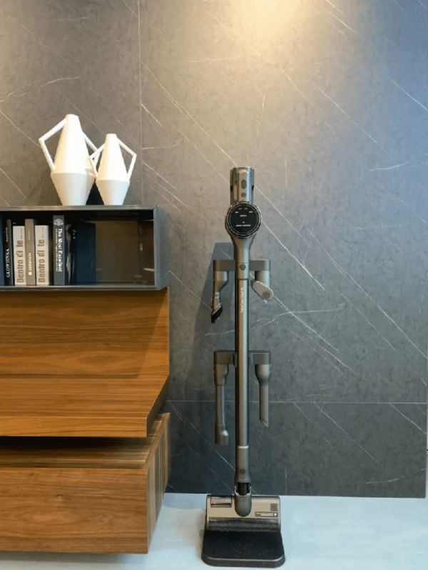 最后说下颜值吧,真的狠狠戳到我的心巴上。很低调的磨砂深灰色,摸起来很光滑。平时用完就和配件一起放在落地挂架上充电。每次有朋友来家里做客都会夸我这个吸尘器颜值高。