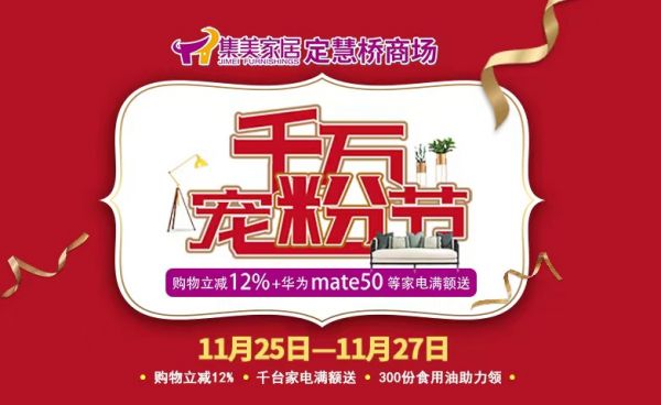 2022年11月25日至27日,集美家居定慧桥商场为了实实在在让惠于家装消费群体,让更多的消费者以最实惠的价格获得最满意的购物体验。集美家居定慧桥商场重磅推出“千万宠粉节”,各种福利轮番奉上,购买立减12%、华为mate50等礼品满额送活动。