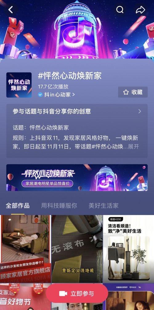 在内容场,除发布在家场景消费新趋势内容短片之外,活动还推出了#怦然心动焕新家 话题,号召品牌商家、达人、用户围绕“梦中情家”展开分享、交流、互动,推动商家与消费者建立深度链接,赢获品销双赢。截止活动结束,#怦然心动焕新家 话题已累计获得超17.7亿次播放。